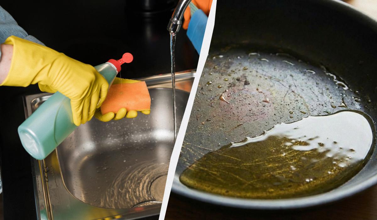 Po pierwsze, pozostawić go na patelni do ostygnięcia lub zgęstnienia. W tym stanie jest łatwiejszy i bezpieczniejszy do usunięcia.